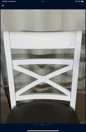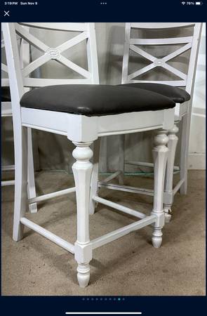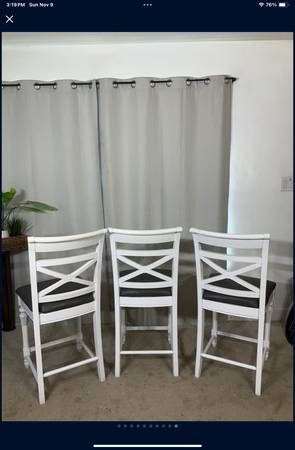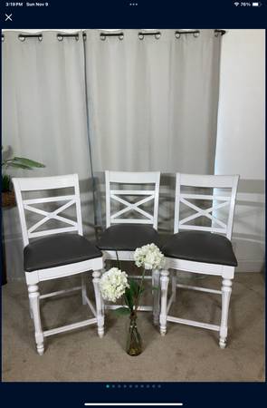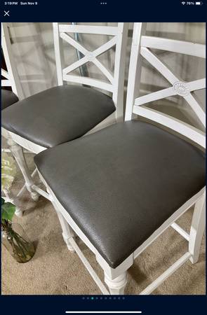 TEXT ONLY * PICK UP ONLY Perfect for your counter, bar or extra seating at your table. Wooden frame with gray faux-leather cushion seats. Solid sturdy construction. Good condition. Measurements:...