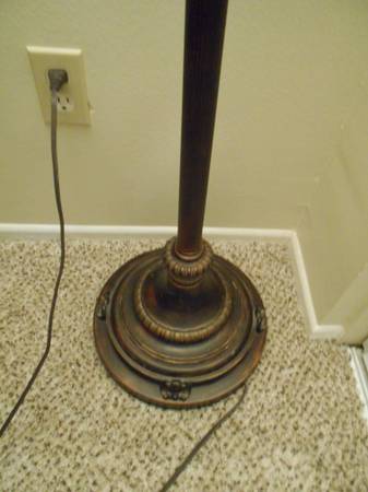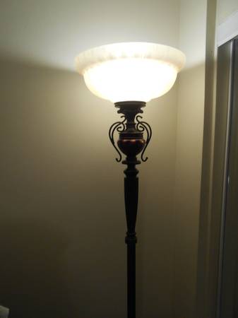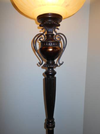 - This torchiere lamp has a classical style, somewhat like ancient Greek or Roman. The shade is made of thick translucent glass with an amber tint to create a soft ambient light. The greatest part of the light shines upward, but the lamp bulbs easily light a good sized room. The lamp comes with a control switch with which you can adjust the light to whatever brightness or softness you desire. The stem is bronze color and is quite solidly constructed. It is so solidly constructed that you need a strong person to carry it. It is NOT lightweight. No plastic. All quality materials. Makes a handsome and high quality lighting piece for your home or office.