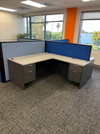 Used L-Shaped Two-Tone Desk (Grey & Slate) with Drawers – $425