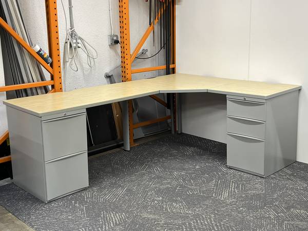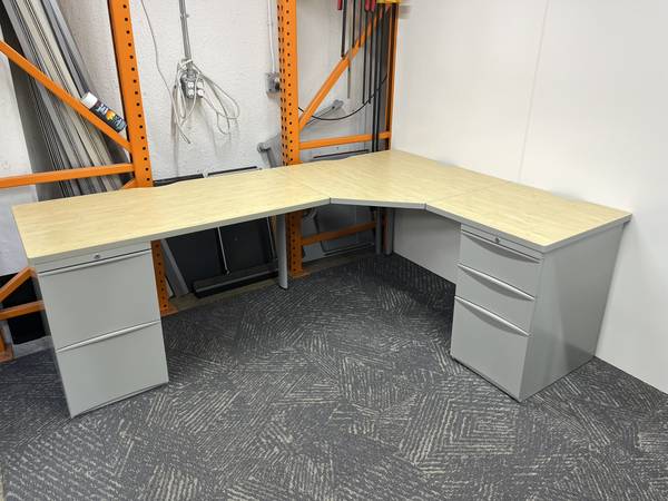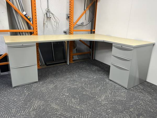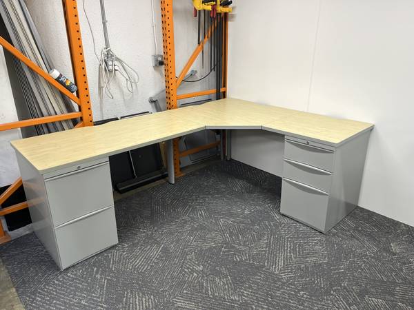 5' x 7' Corner Desk with locking pedestal drawers. available in quantity and different sizes. commercial grade laminate.