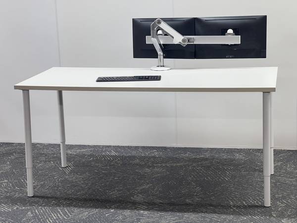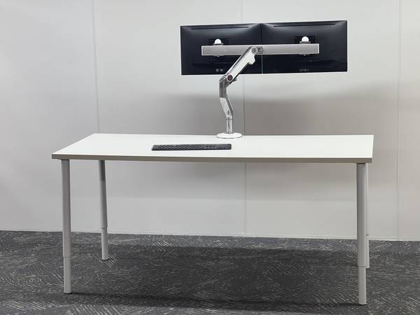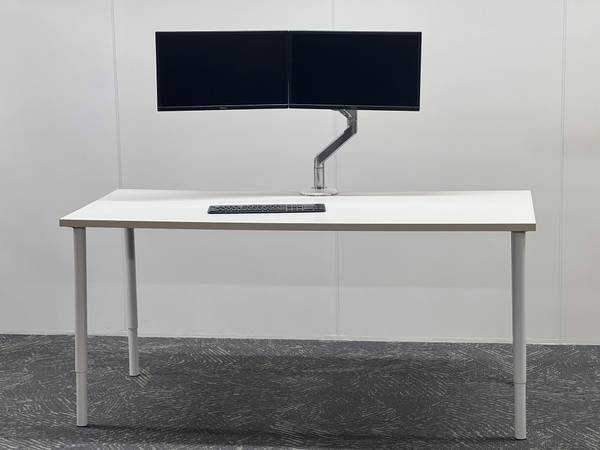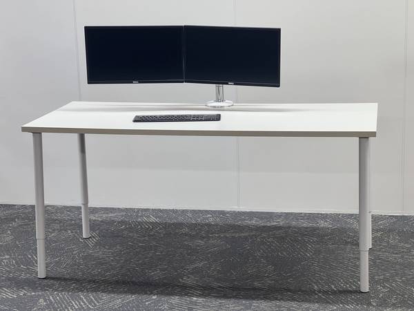 66” x 30” table/desk Height is adjustable from 24” to 37” 24”H, 37”H & 30”H shown in the pictures. $200 $350 with dual monitor arm. Monitors not included.