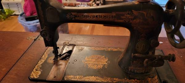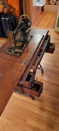 - Old 1900 Singer sewing machine in original cabinet with wrought iron treadle