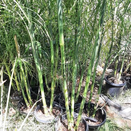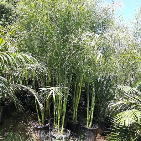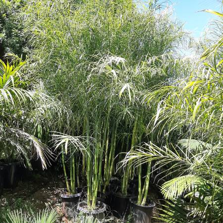 The Baby Queen palm, Chamaedorea plumosa, is a bamboo type palm (NOT the regular queen palm) from Mexico that is easy to grow, drought tolerant, full sun, fast growing and only gets to about 12-15' tall. Grows in a variety of soils. A great accent tree in triples and quads.