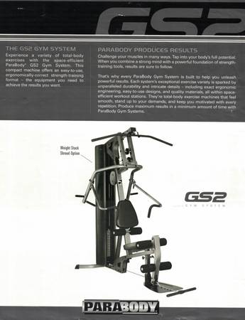 Pre-owned "Life Fitness" brand Parabody Weight Station G2 Model stands out from other equipment through the new Variable Arc press station, which allows you to train all important muscle groups. The Parabody Variable Arc Press Station lets you choose between a fixed and converging arc and do even more versatile exercises. See attached brochure for more features.