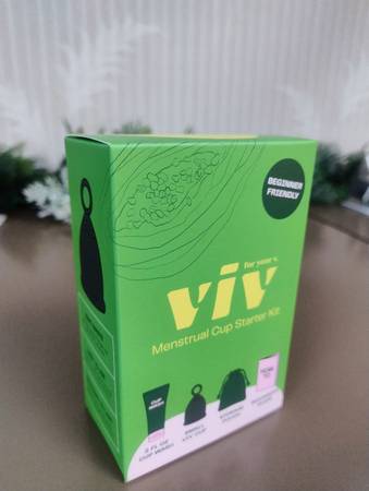 Unopened box of 8 kits; Viv Cup Starter Kit with storage pouch, Viv cup wash, small Viv cup, and beginner's guide