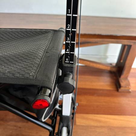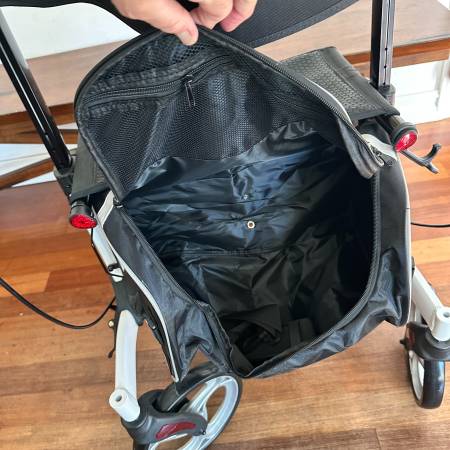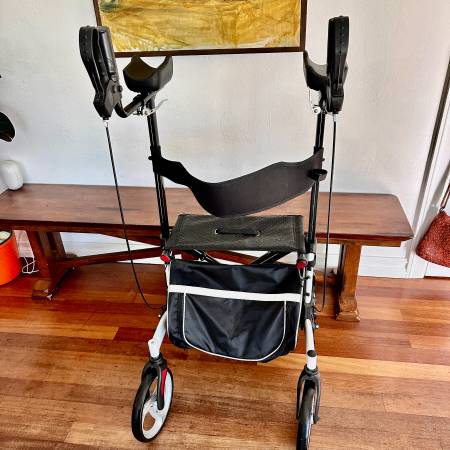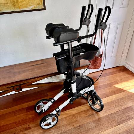 This premium upright rollator promotes comfort and posture while walking. Designed with forearm supports, adjustable height handles, and a comfortable seat, it helps reduce pressure on wrists and back. The sturdy aluminum frame is lightweight, folds easily, and includes a large zippered storage bag for personal items.