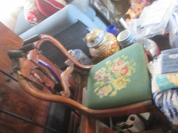 Vintage chair with embroidered seat. seat needs to be re-attached to the chair, but all is good with it (just the chair itself is for sale, nothing around it is)