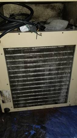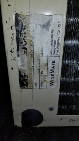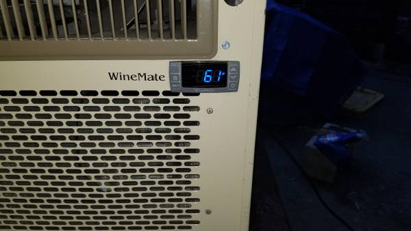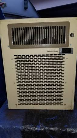 Wine Mate self contained 6000BTU through-the-wall cooling unit, overhauled in 2019 with a new evaporator, dramatically increasing its service life. It has its own separate digital controller with a display visible from the inside. Condensate moisture is removed via evaporation by the built in heat exchanger. This unit has seen no use since 2019. Removed from a 450 cu/ft cellar and is designed to work at elevated ambient temps such as a garage. Temp settings range from 41 to 79 deg.