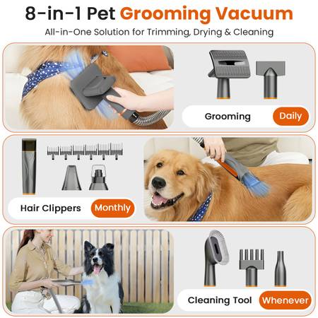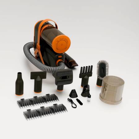 9-in-1 multifunctional grooming kit that vacuum while in use. Includes electric clippers, paw trimmer, nail grinder, 3 blow dryer nozzles, deshedding comb, cleaning brush, suction nozzles, extention...