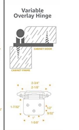 Variable overlay hinge attaches to inside of cabinet door and adjacent cabinet wall