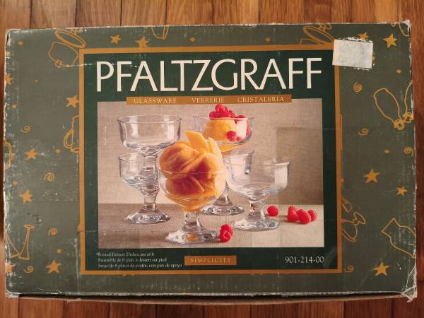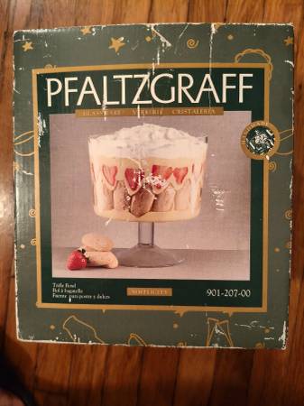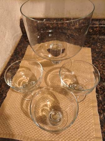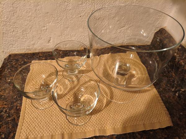 Large, elegant, footed trifle dish with six matching footed dessert dishes for individual servings. The trifle bowl measures about 9 1/2" tall and 8" in diameter.