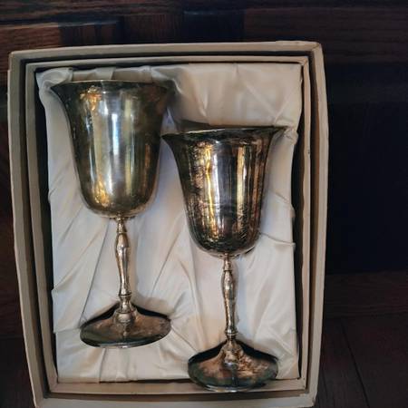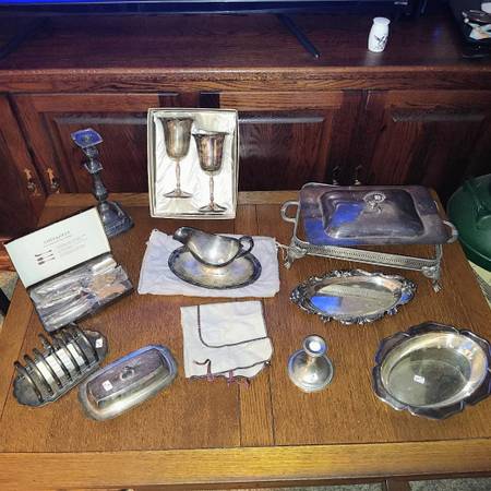 All pieces are silver plate and are at least 50 years old. Covered casserole server, 2 water/wine goblets, butter dish, 2 candlesticks, toast server and small serving trays. You must pic u.