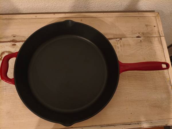 Red, enameled, 12" cast-iron skillet by Tramontina. In perfect condition.