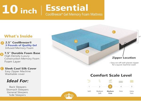 New rolled up in its box...Retails 500 👉 80"L x 60"W x 10"Th 👉 2.5" GEL Memory Foam top layer 👉 Washable cover 👉 Helps prevent night sweat 👉 Size>80"L x 60"W x 10"Th