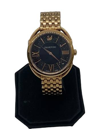 Description: For sale, we have a Swarovski Women's Crystalline Glam Watch. This beautiful watch features a black, crystalline design on the face, encased in a beautiful rose gold case & band. The elegant design features roman numerals and elegant hands to wrap it all together. This 35mm watch is the perfect watch for any one looking to spice up their watch game. Though pre-loved, this beautiful watch shows little to no wear, no major scratches or other flaws. The watch comes alone, with no other accessories. Please see the photos for more details. Feel free to reach out to us with any questions you may have before buying. Thank you!