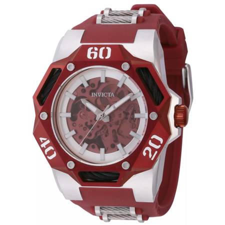 Introducing the stunning Invicta Coalition Forces - IRON DOME men's wristwatch. This luxury timepiece boasts a silver case with a burnt red bezel, fixed bezel type, and a red-tinted skeletonized dial with non-numeric hour marks and a 12-hour dial. The watch features a two-piece strap made of stainless steel and silicone with a Silverstone cable accent, and a black cable accent around the bezel. Water-resistant up to 100 meters, this watch has a mechanical (automatic) movement and an exhibition case back.