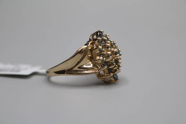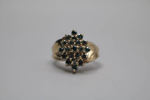 For sale, we have an exquisite pre-owned 10K Yellow Gold Blue Diamond Cluster Ring, boasting a stunning .63 CTW and sized at 6 1/4. This beautiful piece has been professionally cleaned and polished to perfection. It showcases 21 brilliant blue round diamonds, each weighing .03 ct, culminating in a total of .63 ctw and a comfortable weight of 5.1 grams. We offer a convenient layaway program with just a 30% deposit for your ease. For more details, feel free to reach out to us. You can easily pick up this gorgeous ring during regular business hours or opt for shipping, which includes tracking and insurance for your peace of mind. Don’t miss the chance to own this dazzling treasure!