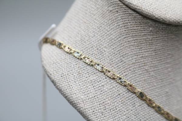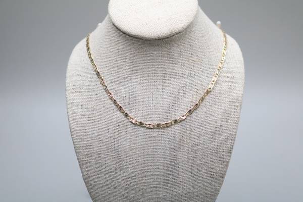 For sale is a stunning 14K Three-Toned Fancy Gucci Chain, a truly exquisite piece that is in excellent condition. This chain has been professionally cleaned and polished, showcasing a luxurious Gucci-inspired design with a captivating three-tone gold finish. Weighing in at a delicate 4.2 grams and measuring a generous 24 inches in length, this piece effortlessly combines elegance and style. We invite you to explore the attached images for a closer look at the exceptional craftsmanship and beauty of this item. To make your purchase even more convenient, a layaway option is available with a 30% deposit. Feel free to pick up this remarkable chain during regular business hours or opt for shipping, which includes tracking information for your peace of mind. Don’t miss the chance to own this fabulous accessory!