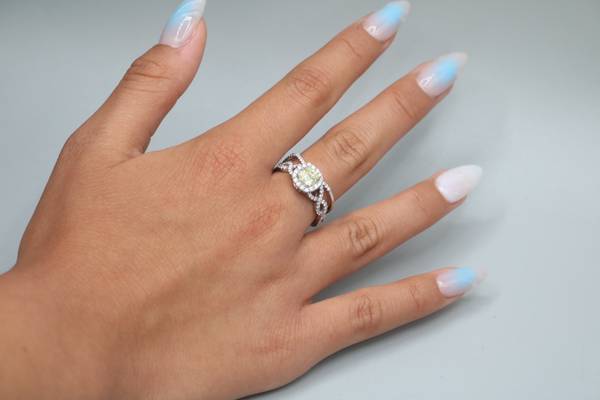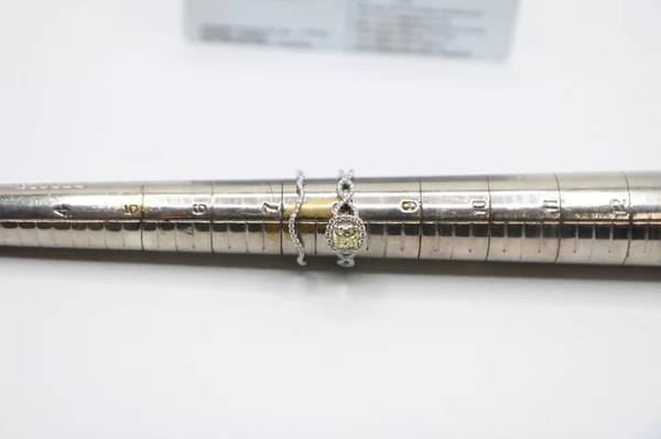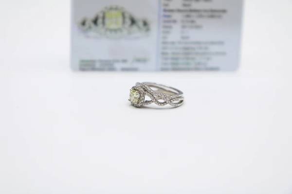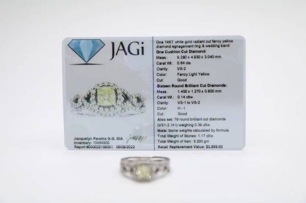 For sale is a stunning pre-owned 14K White Gold Radiant Cut Fancy Yellow Engagement Ring, available in sizes 7 1/4 and 8. This exquisite ring has been meticulously cleaned and polished, ensuring it looks as beautiful as ever. Appraised by JAGi, the ring showcases a remarkable Main Diamond weighing 0.64 ct, featuring a fancy light yellow color and a clarity rating of VS-2. It is complemented by sixteen round brilliant cut diamonds totaling 0.14 ctw, with a color range of H-I and clarity of VS1-VS2, alongside an additional 79 round brilliant cut diamonds of 0.39 ctw, also with an H-I color and clarity of VS1-VS2. Crafted from high-quality 14K White Gold, this ring weighs 5.2 grams, making it a perfect choice for a meaningful engagement. Be sure to browse the pictures for detailed views of its beauty. The Appraisal Report is included in picture #1 and will be available post-purchase confirmation. Shipping includes insurance and signature confirmation, but please note that this item is available for Local Pick-Up only during regular business hours. A layaway plan with a 30% deposit can be arranged. Feel free to reach out for any additional information. Thank you for considering this remarkable piece!