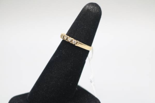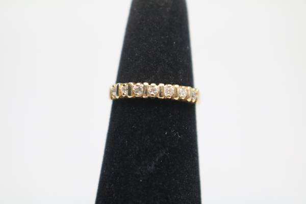 For sale is a stunning 14K Yellow Gold Diamond Channel Band Ring, a true treasure that awaits its new owner! This exquisite piece is in excellent condition, having been professionally cleaned and polished to ensure it sparkles like new. The ring showcases a sophisticated channel setting adorned with 7 round brilliant diamonds, each elegantly weighing 0.03ct (totaling 0.21CTW). These diamonds boast a delightful color quality of G-H and clarity ranging from SI1 to SI2, adding to its allure. We invite you to explore the accompanying pictures for a complete view of this beautiful piece, allowing you to appreciate its charm and craftsmanship fully. Additionally, we offer a convenient layaway plan with just a 30% deposit, making it easier to make this ring yours. Feel free to contact us for any further information. You can pick up your stunning new ring during our regular business hours or choose to have it shipped directly to you, complete with tracking information for your peace of mind. Don't miss this opportunity to own a piece of elegance!
