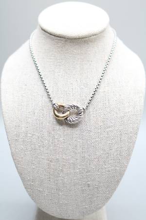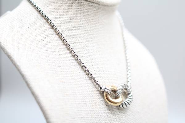 Check out this stunning pre-owned David Yurman Sterling Silver & 18K Gold Belmont Curb Link Necklace (17 Inches). It has been professionally cleaned and polished and features a beautiful Belmont curb link design in sterling silver with an 18K yellow gold charm. The necklace is 17 inches long and weighs 12.5 grams. Take a look at the attached photos for more details. You can secure it with a 30% deposit using our layaway plan. Pick it up during business hours or have it shipped with tracking and insurance.