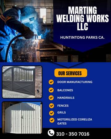 Welding service, manufacturing of doors, gates, railings, stairs, roofs, handrails, balconies, sliding gates, and general repairs. We are licensed and insured.
