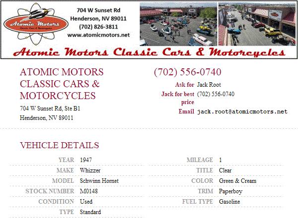 This vehicle is located at Atomic Motors Classic Car Sales and Restorations in Henderson, NV just 20 mins from the fabulous Las Vegas Strip. Come down and see us or call at 702-826-3811 ext 2. We are on-line at www.atomicmotors.net