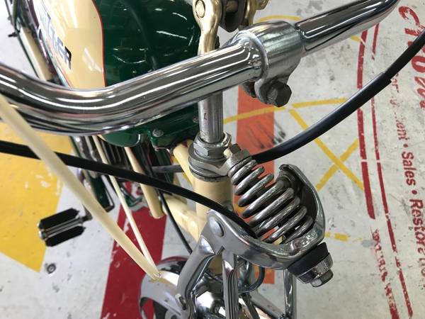 This specific Schwinn Whizzer is probably a Model H that was then retrofitted for Newspaper Delivery. The Model H kit retailed for $97.55. Although Cleveland Welding originally built a bike specifically for the Whizzer in ’47, after a patent conflict, Whizzer partnered with Schwinn.