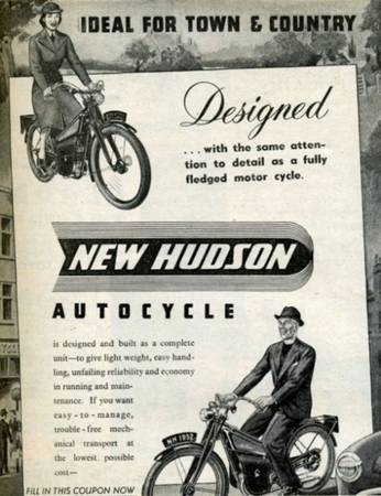 Having ceased motorcycle production in 1933, New Hudson returned briefly to the manufacture of two-wheelers in 1940 with the Autocycle. The engine was Villiers' JDL and the Autocycle featured pedal transmission and a rigid front fork. Production resumed in 1946, by which time New Hudson was owned by BSA. Post-war developments included the adoption of pressed-steel, blade-type girder forks in 1948 and the Villiers 2F engine, necessitating major frame changes, the following year. The 2F remained when the Autocycle was revamped with a new 'easy access' open frame and tubular girder fork in May 1956. Deletion of the 2F brought an end to Autocycle production in 1958.