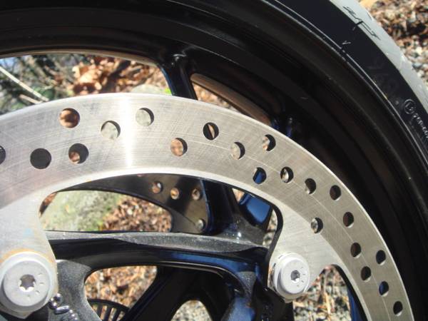 Factory cross-hatching visible on the brake rotors, factory grease still on the chain, that's a tire nub in the center of the tire tread. 74 miles.