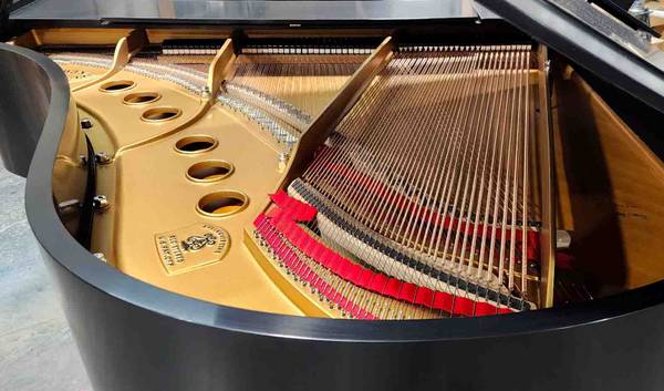 New satin lacquer finish with polyester high-gloss fallboard face (to avoid scratches) and urethane high-gloss under-lid finish to support mirror-like reflection of the stringed interior