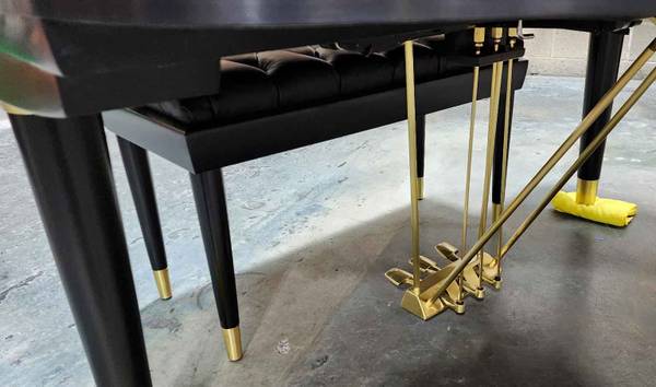 The hand-rubbed, satin ebony finish comes from the nationally recognized STORER Refinishing facility and beautifully showcases the piano’s sculptural elegance. The accent-setting brass hardware has been polished to a warm, understated luster.