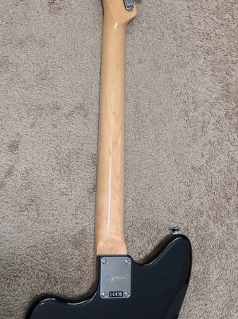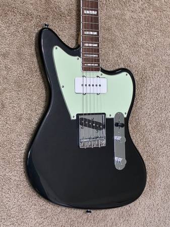 Squier Paranormal Offset SJ electric guitar- limited edition, Jazzmaster neck pickup and Telecaster bridge pickup, black body and matching headstock, almost new (tried only once), in good physical...