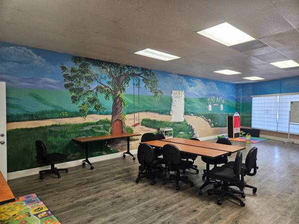 This is an open space where the rolling tables (5) and chairs (20) can easily be rearranged. It has a bright mural painted on the wall. A great space for enrichment/education/classes for kids, tutoring, or workshops. There are children’s rugs to section off areas. A library space is available. There is a kitchen with a fridge. Hourly rate or contact for more long-term options.