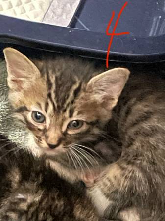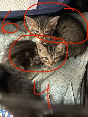 6- 9 week old kittens (litter trained and eating dry food) 1- Approx. 2 year old female cat Small rehoming fee