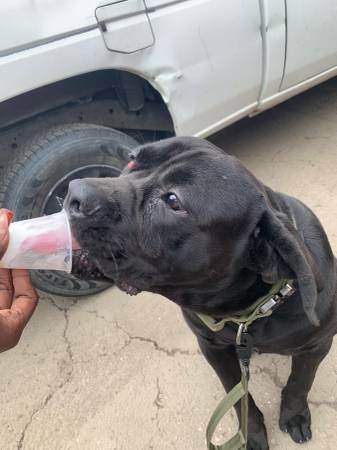 Duce~ Black Cane Corso who loves attention. He's a big baby. Duce enjoys walks and fake playing fetch. He also loves tug. Loves t be up under his person, getting all the cuddles. He doesn't play games although he will try! Duce would thrive in a home with no cats and needs patient introductions. Ideally a home with a yard but walks can do just fine. he needs chew toys though. Duce was crate trained but is currently outdoors. He knows basic commands, and pulls on the leash.