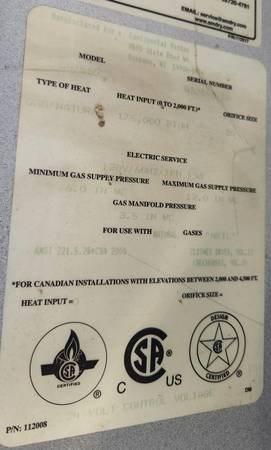Natural Gas Pressure: 10.5 / 6.5 / 5 wc (max / recommended / min)