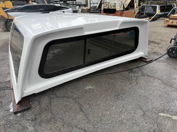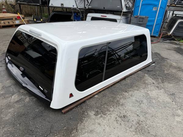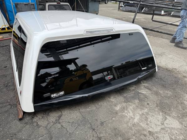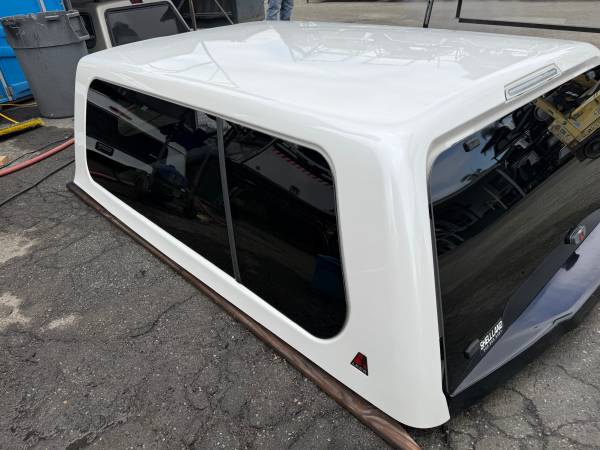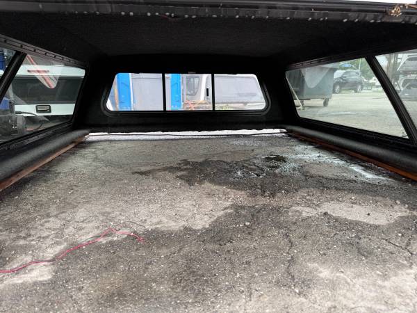 Selling a used AZ Pearl White LEER 100XL for a 2017-2022 Ford Super Duty with the 6'9ft bed. Has a front removable sliding window, carpet headliner, frameless tip out side windows, and a frameless rear door with a center lock and key. Has a few blemishes on passenger side roof as seen in photo.
