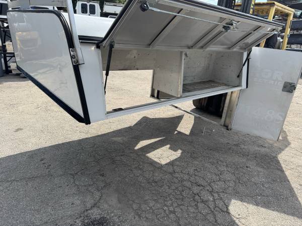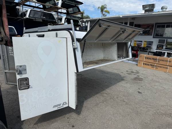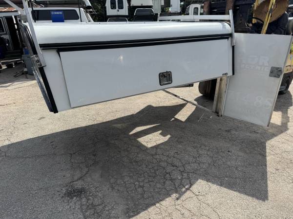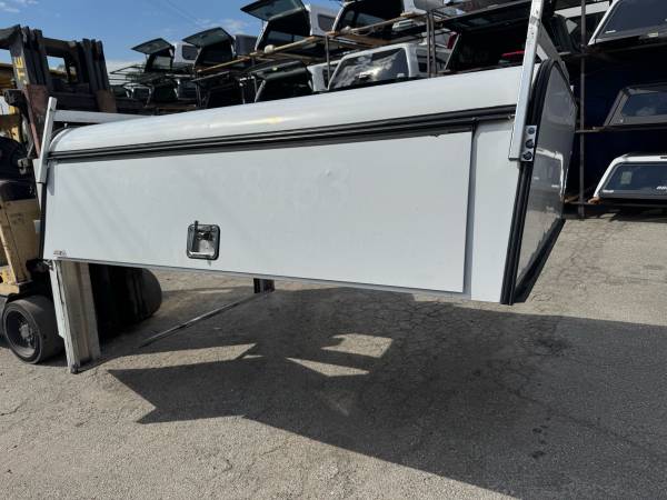 Features full side access doors, half size toolbox on driver side, half size toolbox on passenger side, front solid wall, double rear doors, ladder rack, and key.