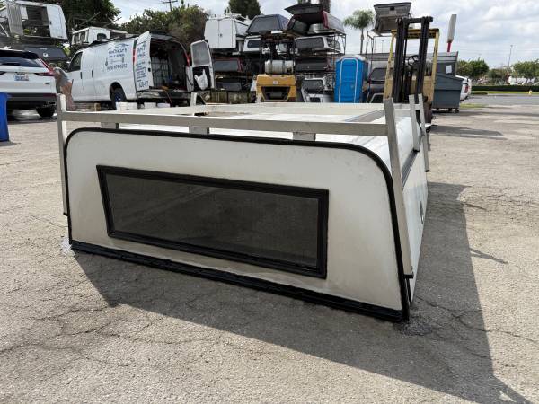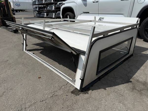 Selling a used 23" ARE DCU for a 2005-2015 Tacoma with a 6ft bed. Has a front solid glass window, side access doors, a rear door with a window and security screen, and a ladder rack.