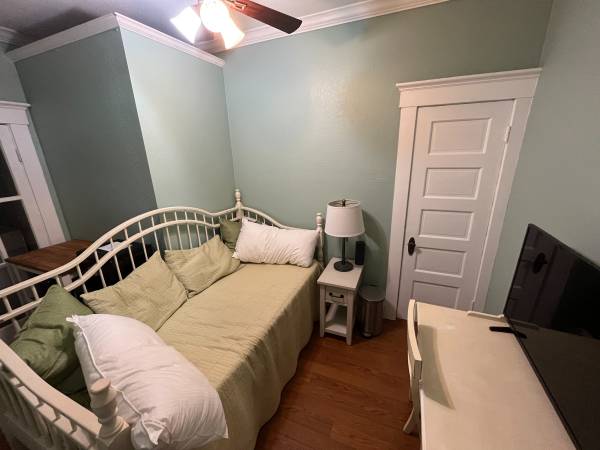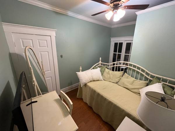 Separate Entrance, Fully furnished, recently painted cozy room for rent in a quiet, mature neighborhood by the greenbelt and Colorado Lagoon, centrally located between CSULB, 2nd Street, Alamitos Bay and the Ocean. Room Only. Has a surprisingly large walk in closet (approx 5' X 6'), a small kitchenette space, bathroom is a shared space, includes use of full size washer/dryer and laundry, freezer, tub/sink, all utilities included.