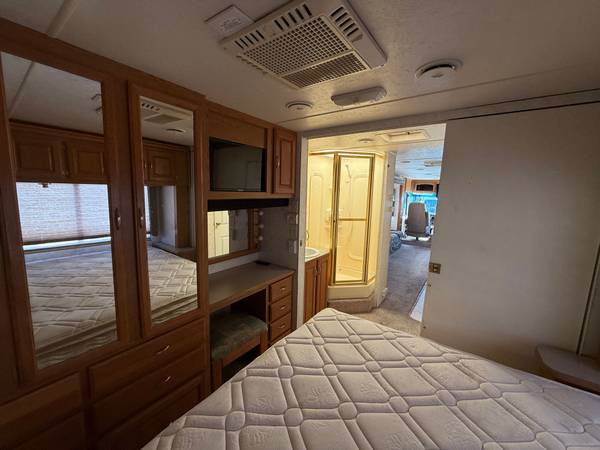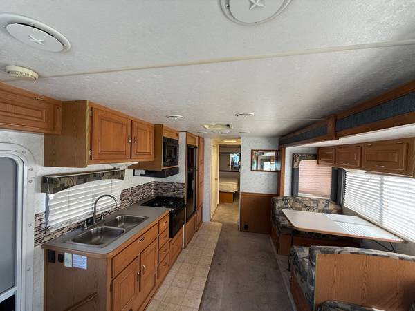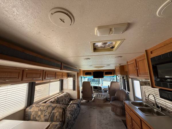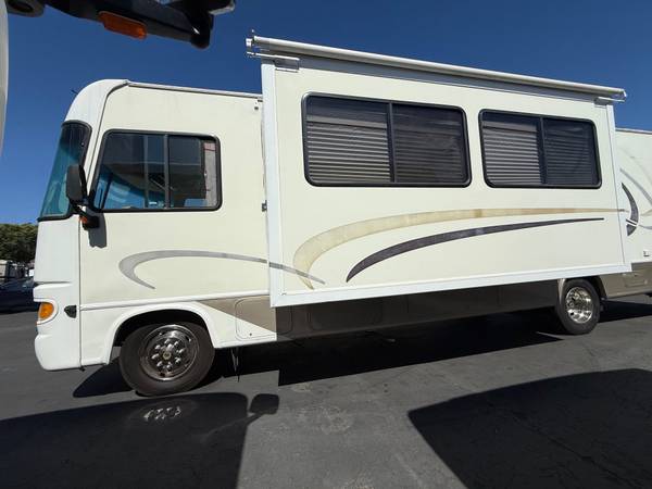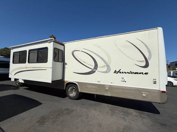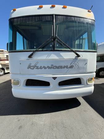 Step into adventure with the 2003 Hurricane 32R Motor Coach—a spacious, well-appointed Class A RV designed for comfort and convenience on the open road. Measuring approximately 32 feet in length, this coach features a thoughtfully laid-out floorplan with dual slide-outs that expand the living and bedroom areas for maximum space. Inside, you'll find plush seating, a fully equipped kitchen with ample cabinetry, and a cozy dinette perfect for meals or game nights. The private rear bedroom offers a walk-around queen bed, generous storage, and direct access to the full bathroom with a large shower. Powered by a reliable Ford Triton V10 engine, the Hurricane 32R delivers smooth performance and confident handling. With its abundant basement storage, onboard generator, and ducted A/C system, this motor coach is ready to take you wherever the road leads—whether it's weekend getaways or cross-country adventures.