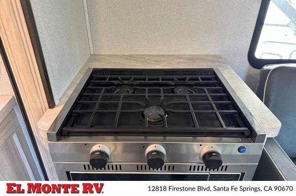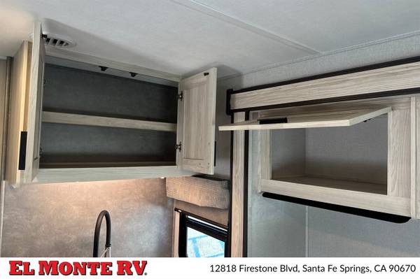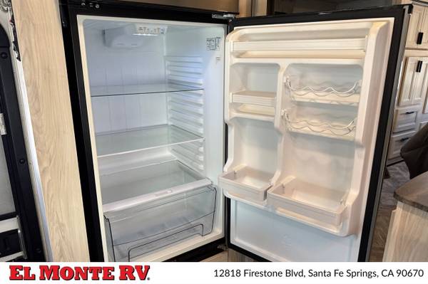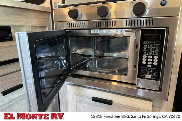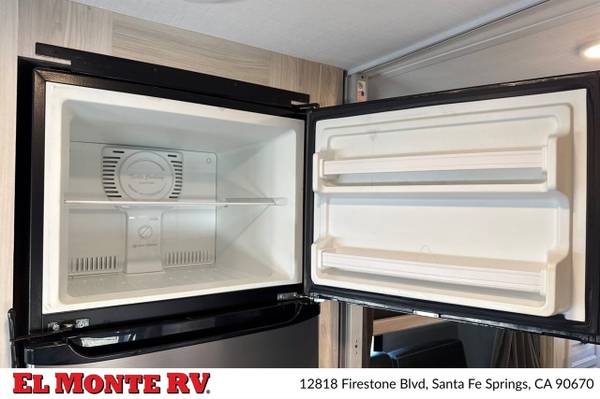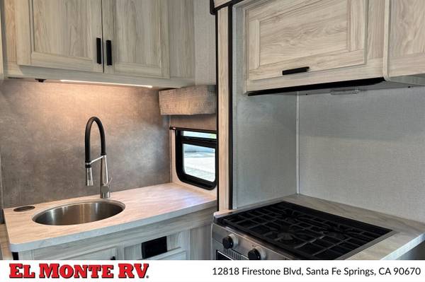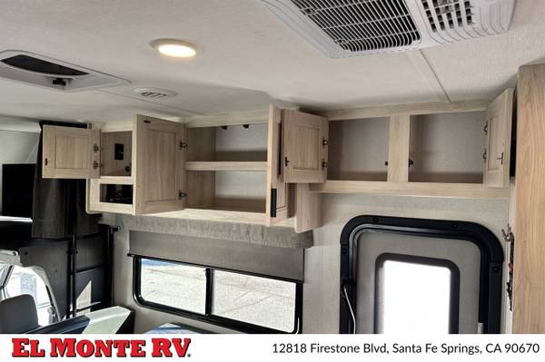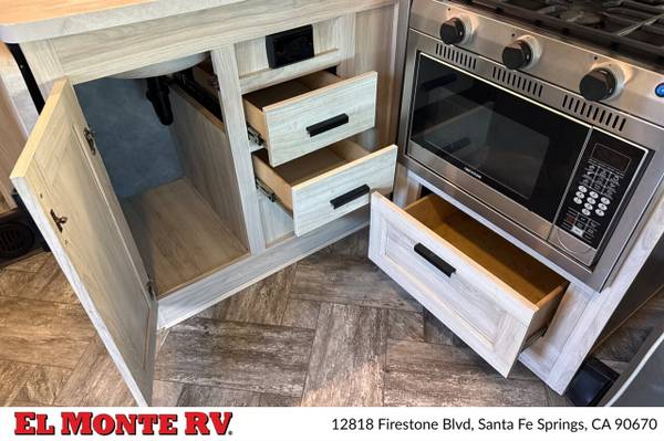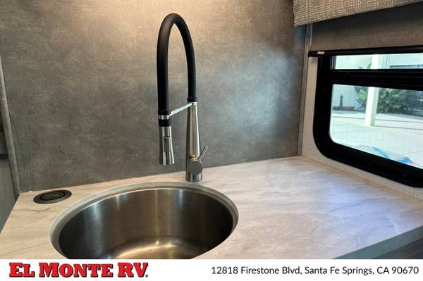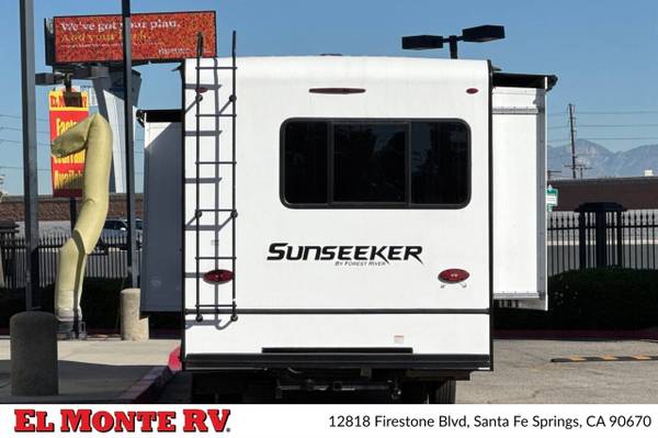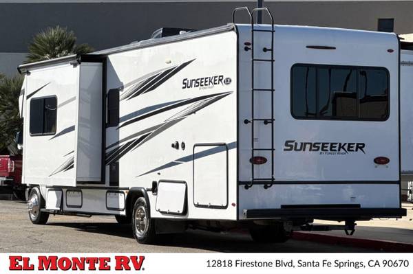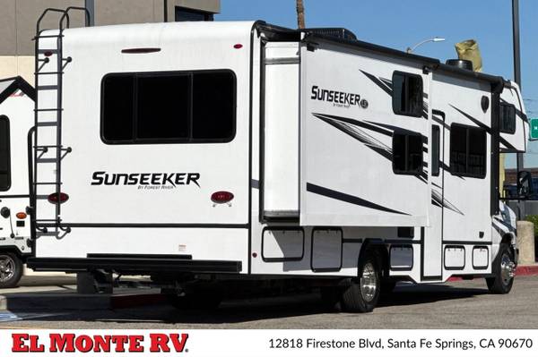 The vehicle is equipped with ample storage options, including pass-through storage compartments that allow for easy access to your gear. An exterior shower is also included, making it convenient to rinse off after outdoor adventures. The Sunseeker features a 4,000-watt generator, ensuring that you have power wherever you go, and an automatic leveling system that simplifies parking and setup at your destination.