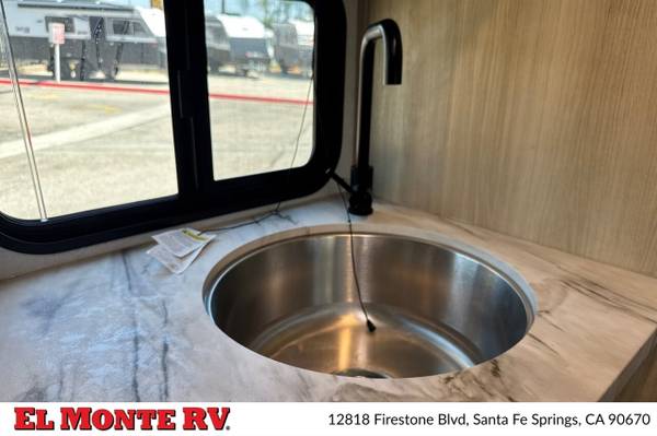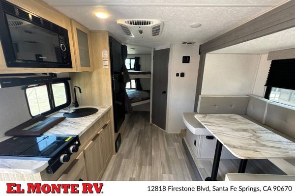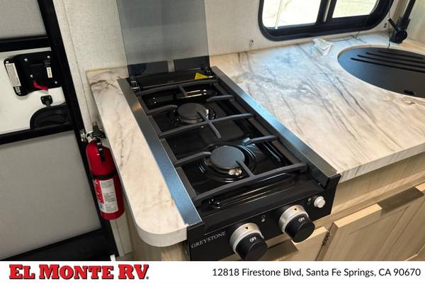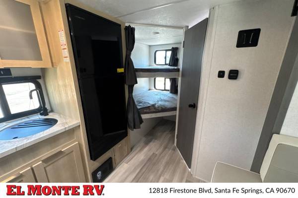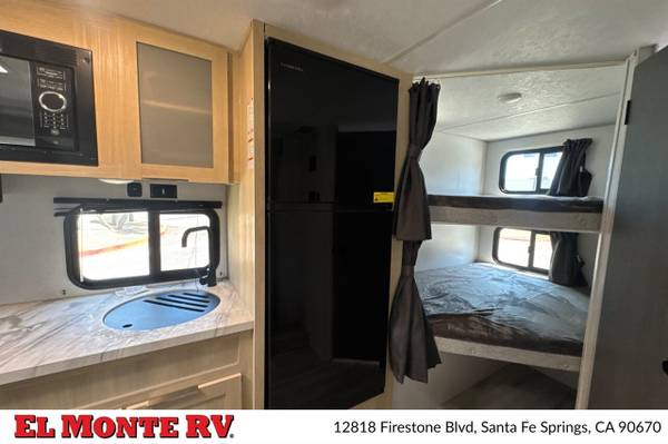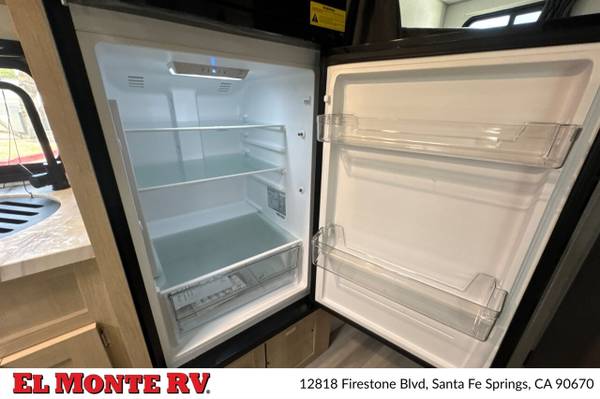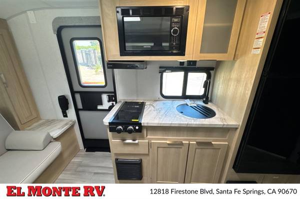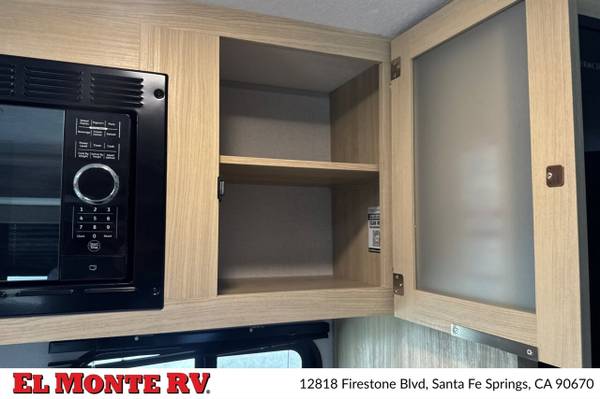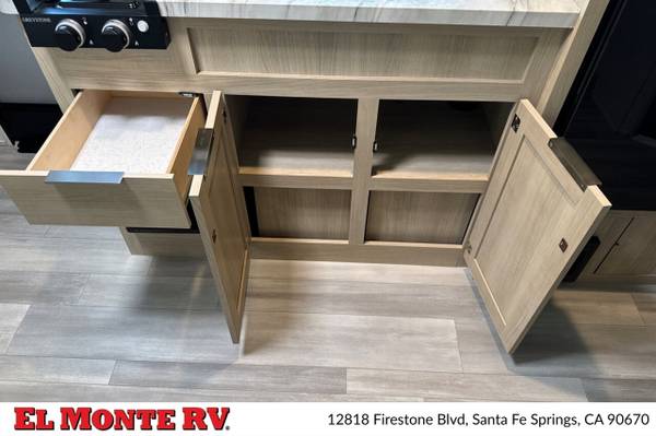 Kitchen: The kitchen in the 2023 WILDWOOD FSX PLATINUM is a chef's dream, featuring high-end appliances, ample counter space, and plenty of storage options. The residential refrigerator allows you to keep all your favorite foods and beverages cold and fresh, while the three-burner cooktop and oven make it easy to whip up delicious meals on the go. The oversized sink and high-rise faucet add a touch of luxury to the kitchen, making cleanup a breeze.