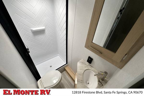 Bathroom: The bathroom in the 2023 WILDWOOD FSX PLATINUM is designed for comfort and convenience, with a spacious shower, a foot-flush toilet, and a large vanity with a sink and storage space. The skylight in the shower lets in natural light and ventilation, creating a bright and airy atmosphere. The Platinum package includes a power vent fan that helps keep the bathroom fresh and odor-free, even during hot showers.
