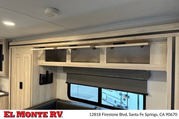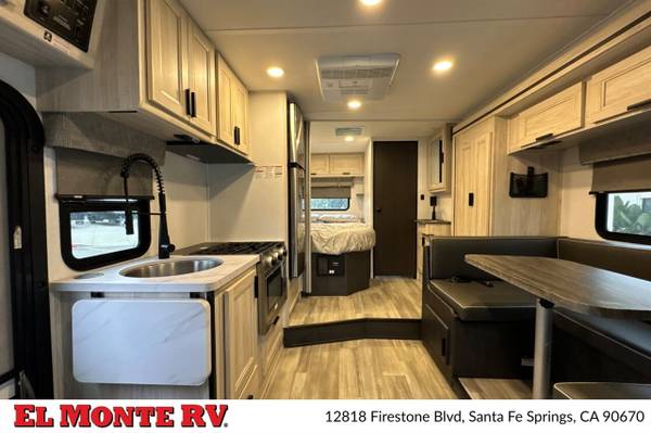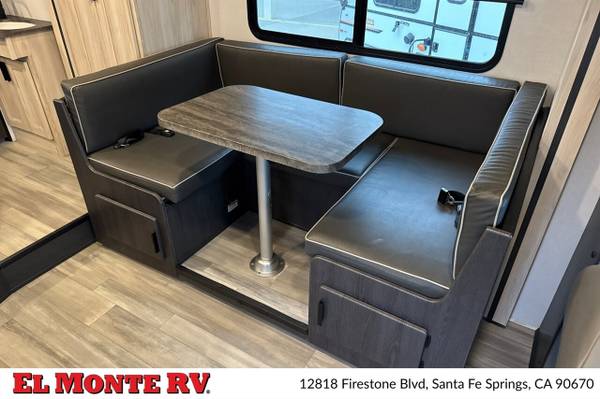The dining area includes a booth-style dinette that comfortably seats four and can also convert into a bed, allowing for flexible sleeping arrangements. Overhead cabinetry provides additional storage for kitchen essentials, ensuring that everything you need is within reach.