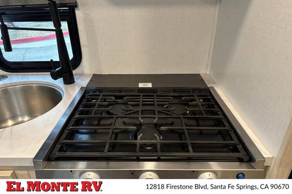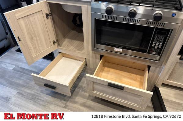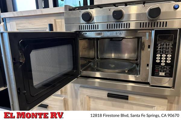 The fully-equipped kitchen is a highlight of the interior, designed for both functionality and ease of use. It features a three-burner gas cooktop, a microwave, and a spacious refrigerator, providing all the conveniences of home. The solid surface countertops offer ample prep space for meal preparation, while a deep sink with a high-arc faucet makes cleanup a breeze.