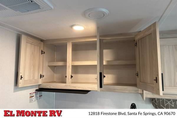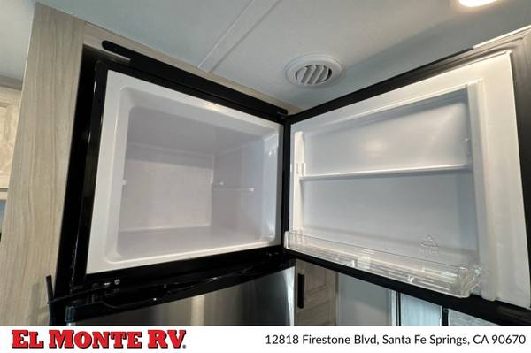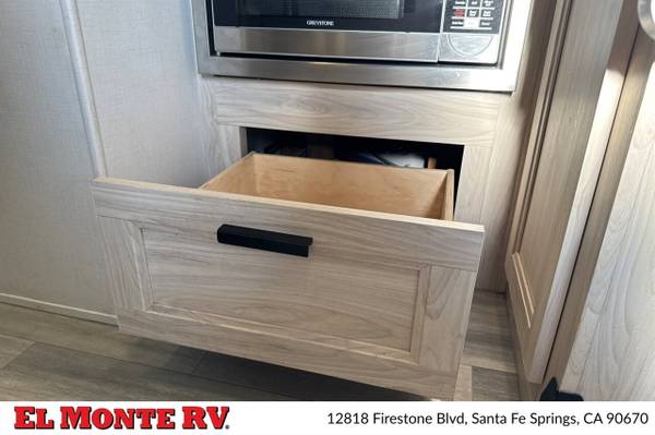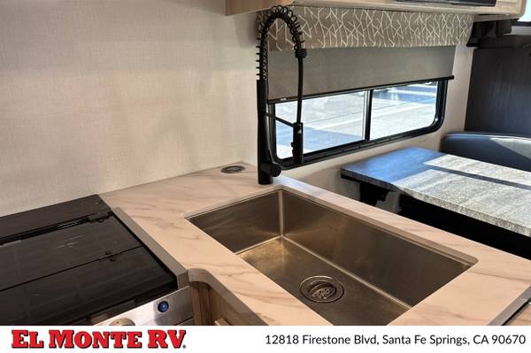 The galley kitchen is efficiently designed with modern appliances and ample counter space. Standard features include a three-burner gas cooktop, a microwave oven, and a refrigerator/freezer combo that offers plenty of storage for perishable items. The deep stainless-steel sink is equipped with a high-arc faucet and a convenient cutting board, allowing for easy meal prep. Storage solutions abound, with overhead cabinets and drawers providing space for all your cooking essentials.
