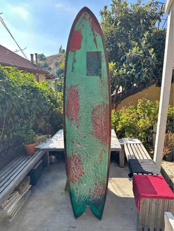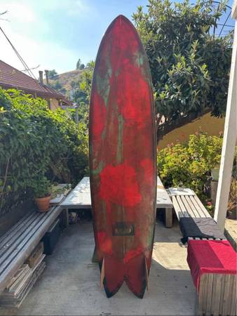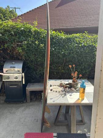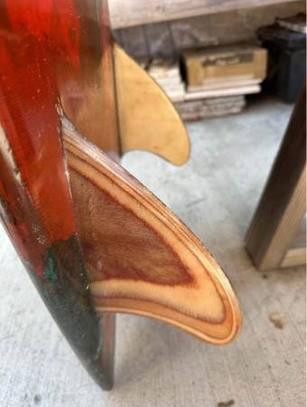 7’7”x 21 3/4” x 2 3/4” Pigment tinted Low rocker Glassed-on plywood keels & leash loop Slight rolled bottom Excellent choice for point breaks...