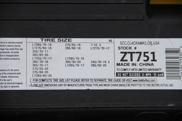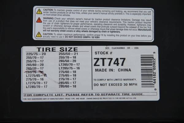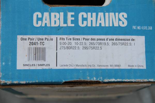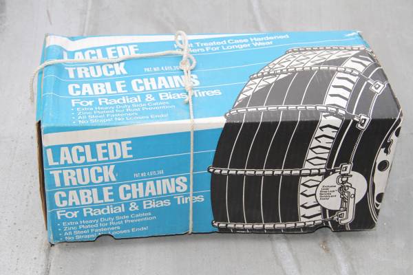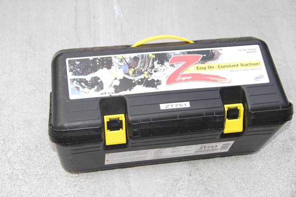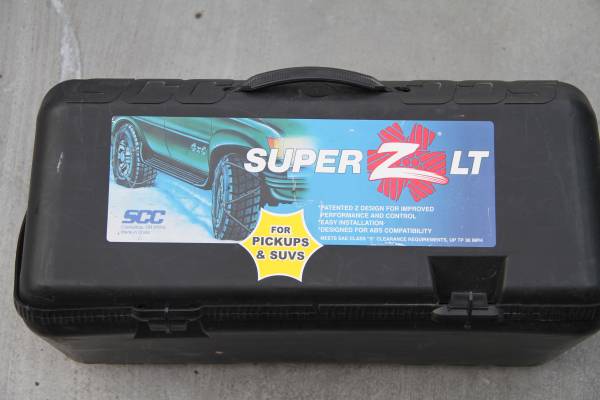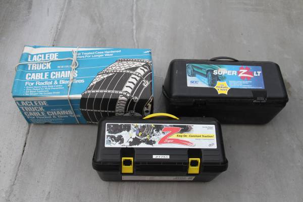3 SETS OF DIFFERENT SIZES SNOW CHAINS All Sizes are on the Pictures, All Chains are NEW 1.Laclede Heavy Duty Chains - $60 2 Super Z Snow Chains, Different Sizes on Each Carry Box - $40ea If...
